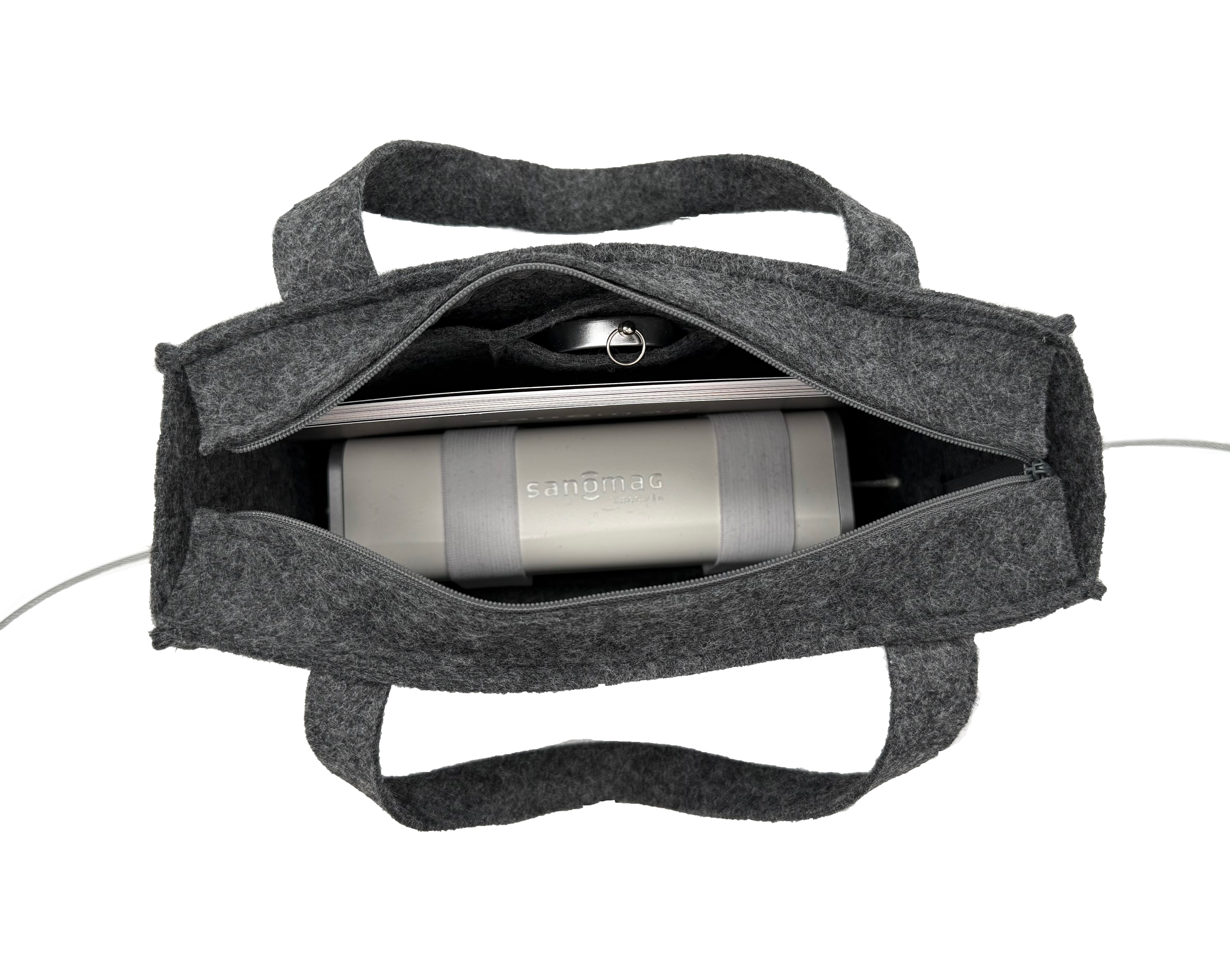 Die SANOMAG® Tragetache wurde speziell für den SANOMAG® entwickelt und verbindet Funktionalität mit ansprechendem Design. Die Tasche ist aus hochwertigem Filz, in 100% Handarbeit gefertigt. Durchdachte Details wie Fixierbänder und Innenfächer sorgen für Ordnung und sicheren Transport.